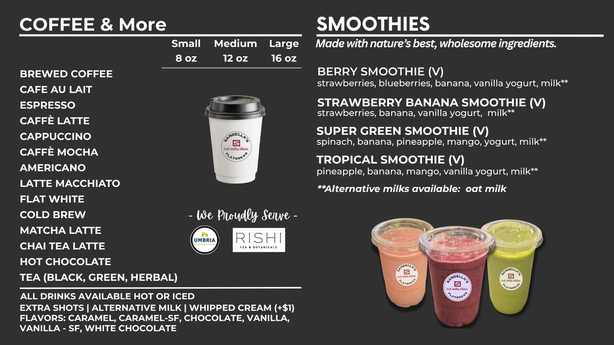 Welcome to Sandella's Flatbread Café, now offering Caffe Umbria's premium brews. Enjoy our signature flatbreads, refreshing acai bowls & smoothies, and artisanal coffees--perfect for travelers seeking fresh, healthy, and delicious options. Place an order online by clicking the link below or scan this QR Code today!